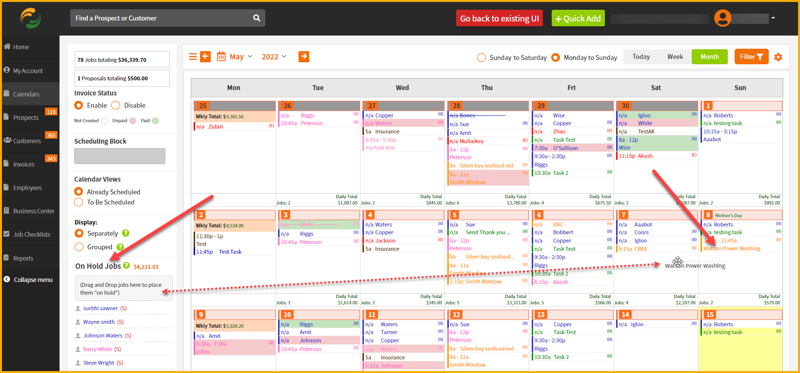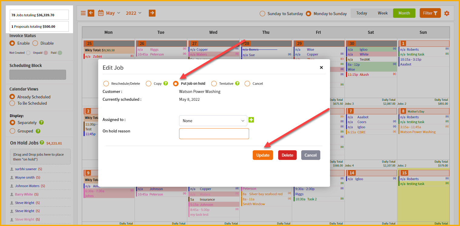 We have two ways to put a job on hold. First, if the job is currently scheduled and you are on the Monthly Calendar screen, you can drag and drop the job into the On Hold area on the left-hand side of the screen.