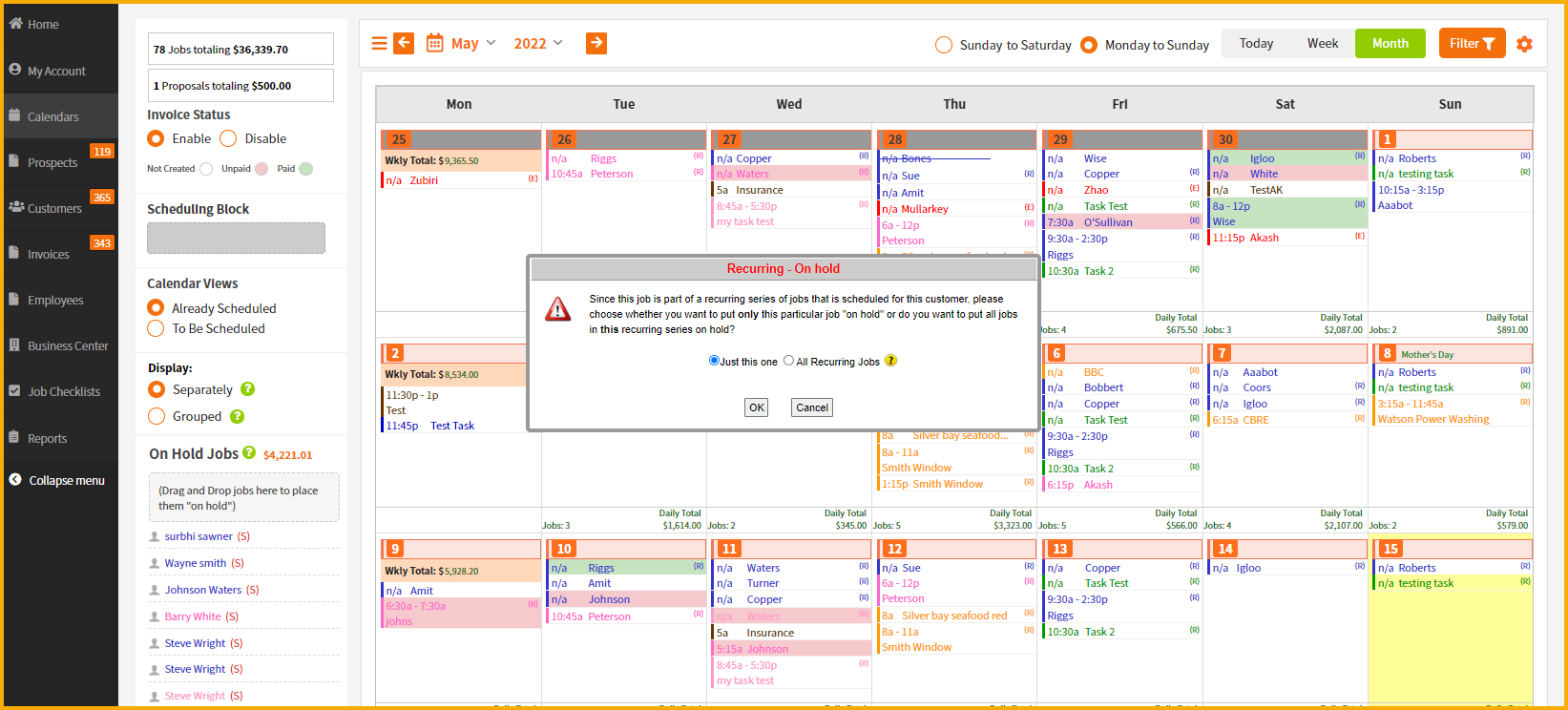 Should you put a recurring job on hold, there will be a pop-up prompting you to choose to hold that job just one time or to hold all the recurring jobs.
