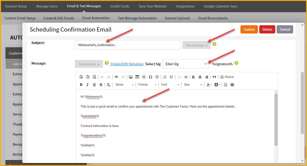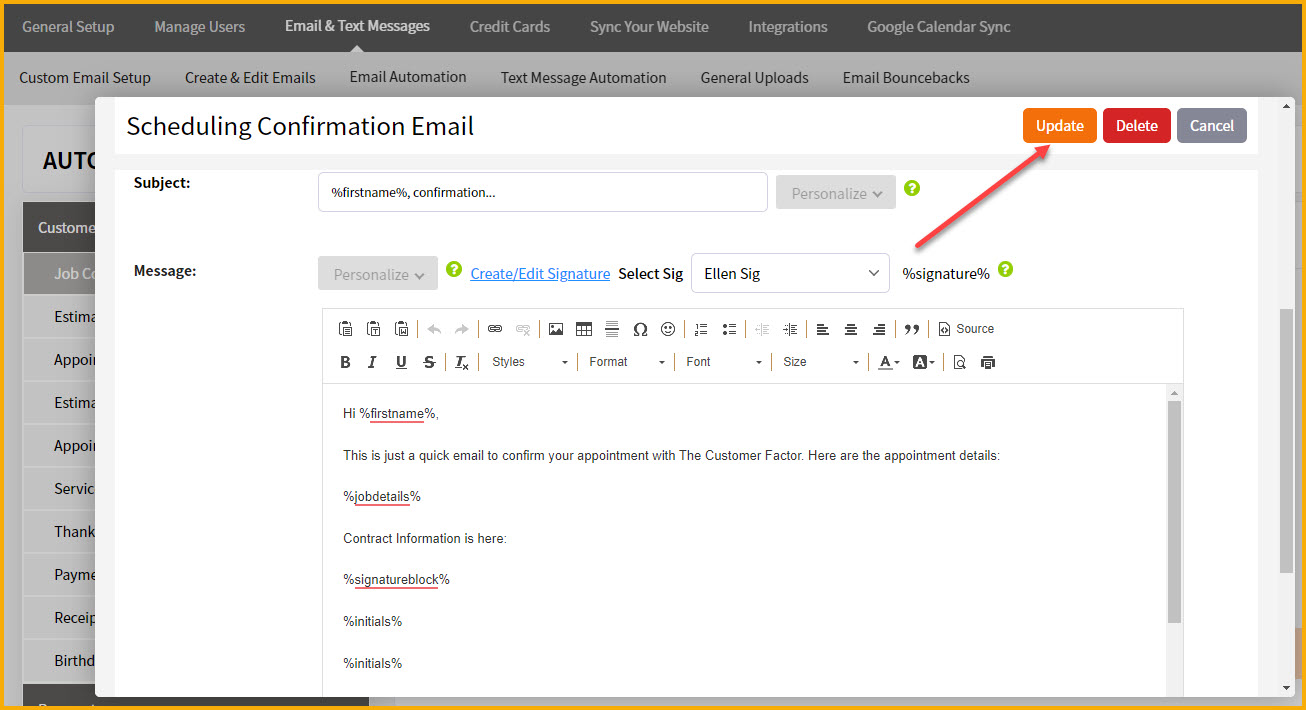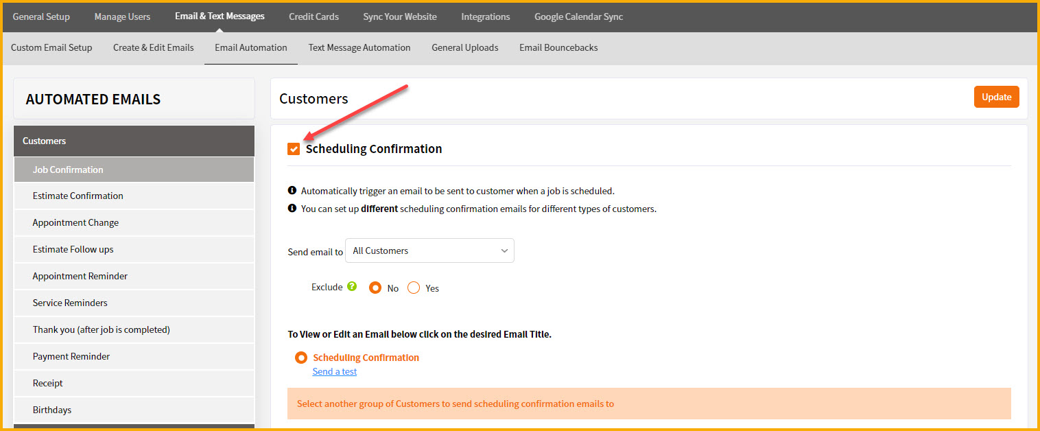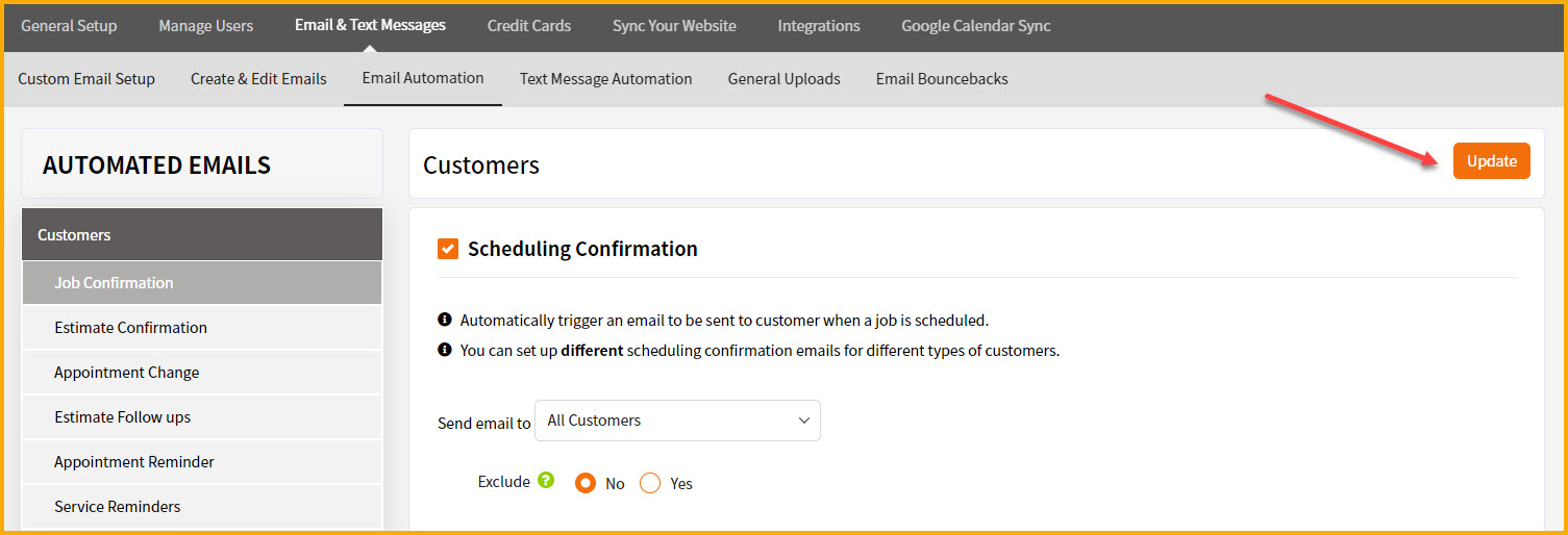 As a side note, not all users are interested in sending scheduling confirmation emails. You may be more interested in our automated appt reminder emails. To compare the two, as mentioned above the scheduling confirmation emails get sent right away when a job is scheduled. The appt reminder emails get sent x number of days prior to the appt. You may want to set up both emails or you may care more about just setting up the automated appt reminder emails. If that's the case, here is the article on setting up appt reminders.