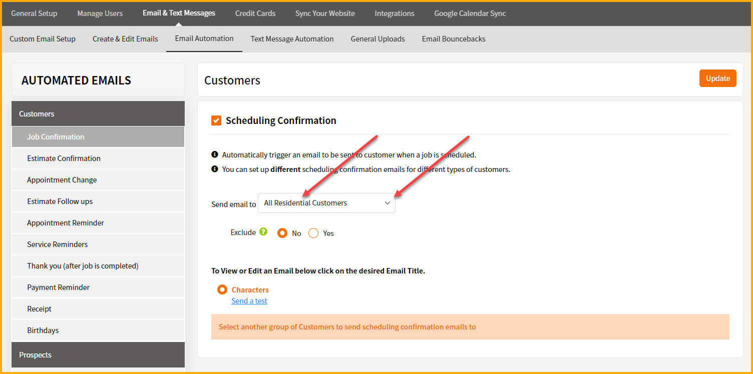 You can then select from the dropdown the type of customer you want to send this email to. For example, maybe you want residential customers to receive one kind of email and commercial customers to receive a different kind of email (you can select multiple groups). Or maybe you want just residential customers to receive scheduling confirmations. So you have choices. In our example, we'll just send scheduling confirmation emails to residential customers only.
