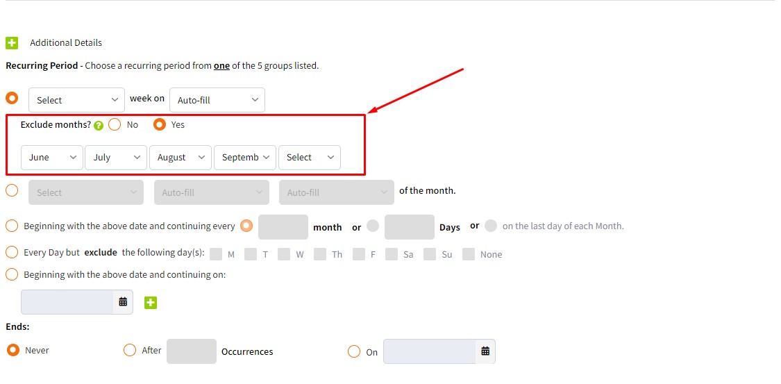 - Scroll down a bit more to the recurring options and choose from five recurring period choices:
