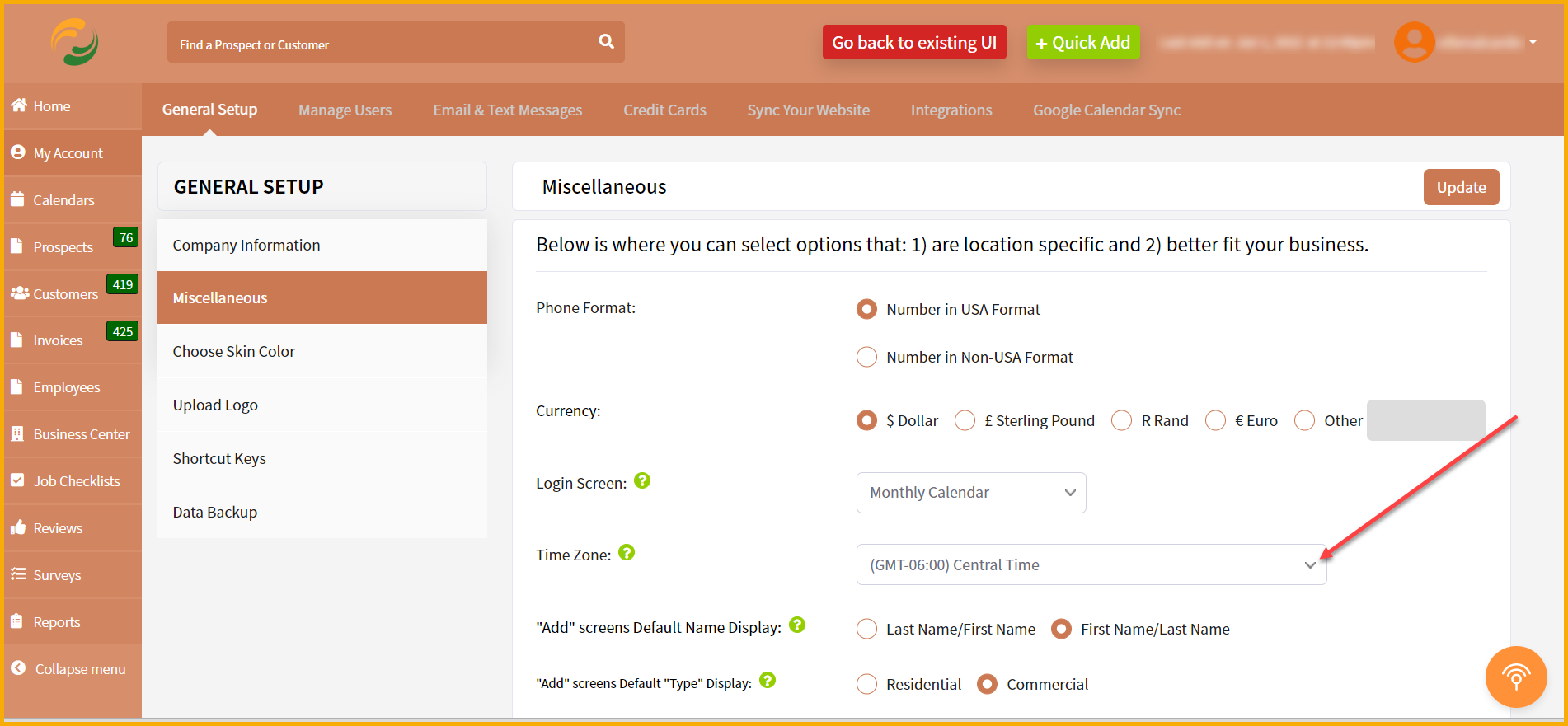 This setting in The Customer Factor is important. It controls the correct times that emails and text messages were sent, and it allows you to see the correct clock-in/out time and job time in/out information that displays on the daily calendar. Plus, the login history time is controlled by your time zone.
