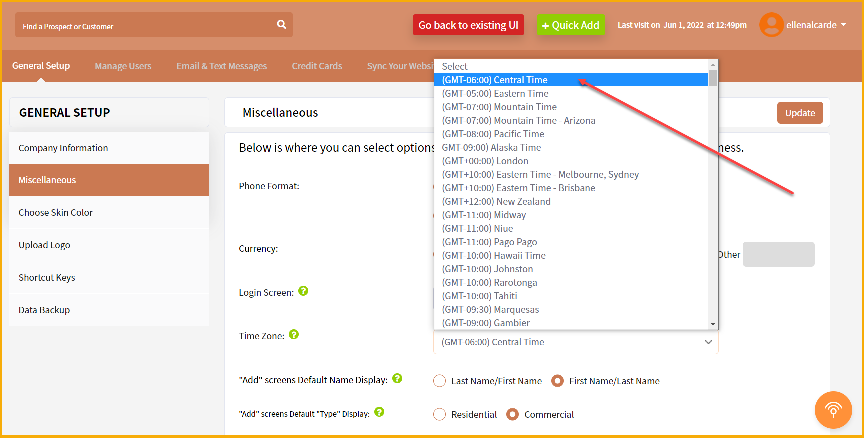 So...to set up the Time Zone, go to the "My Account" tab at top left and click on "General Set up". Scroll down and you will find the Time Zone dropdown in the "Miscellaneous" area as shown below.