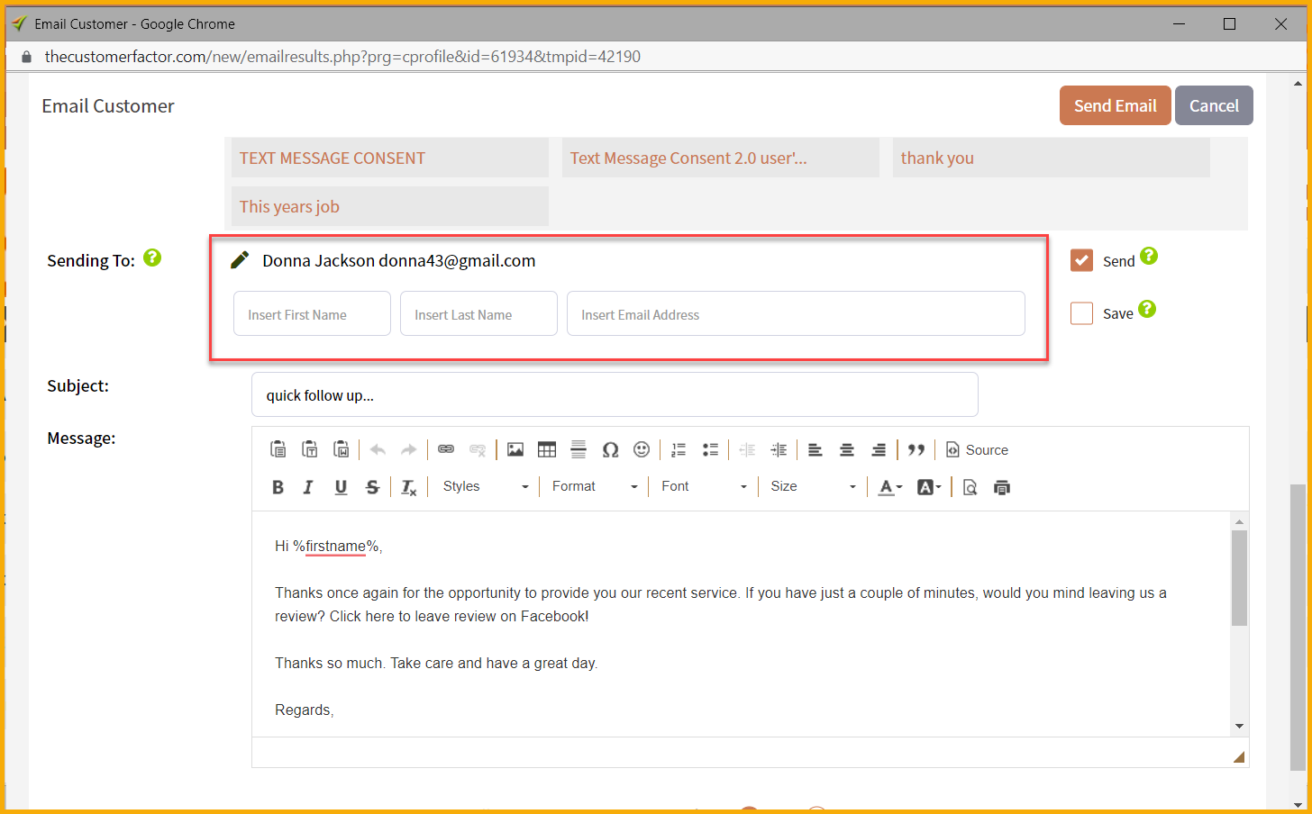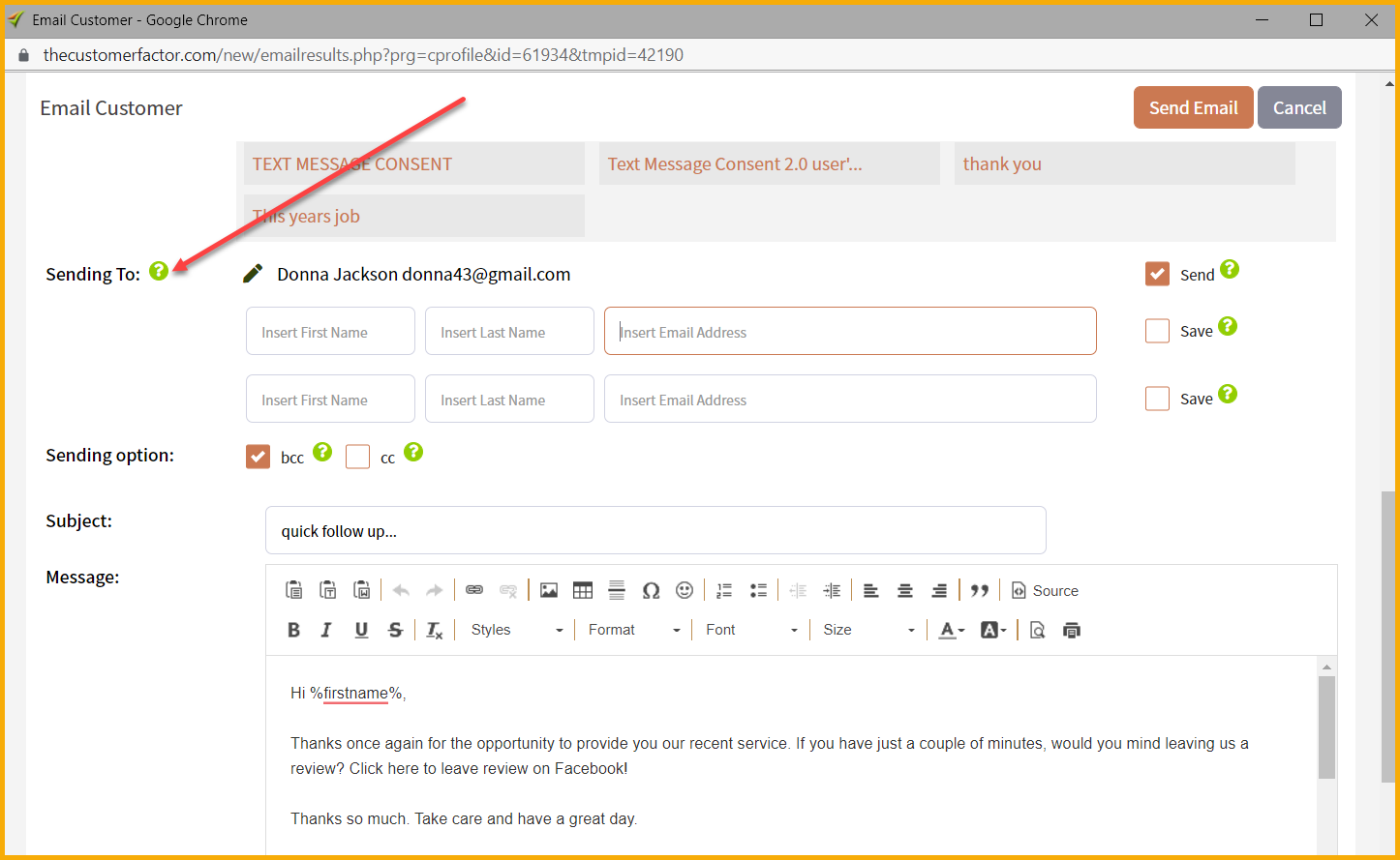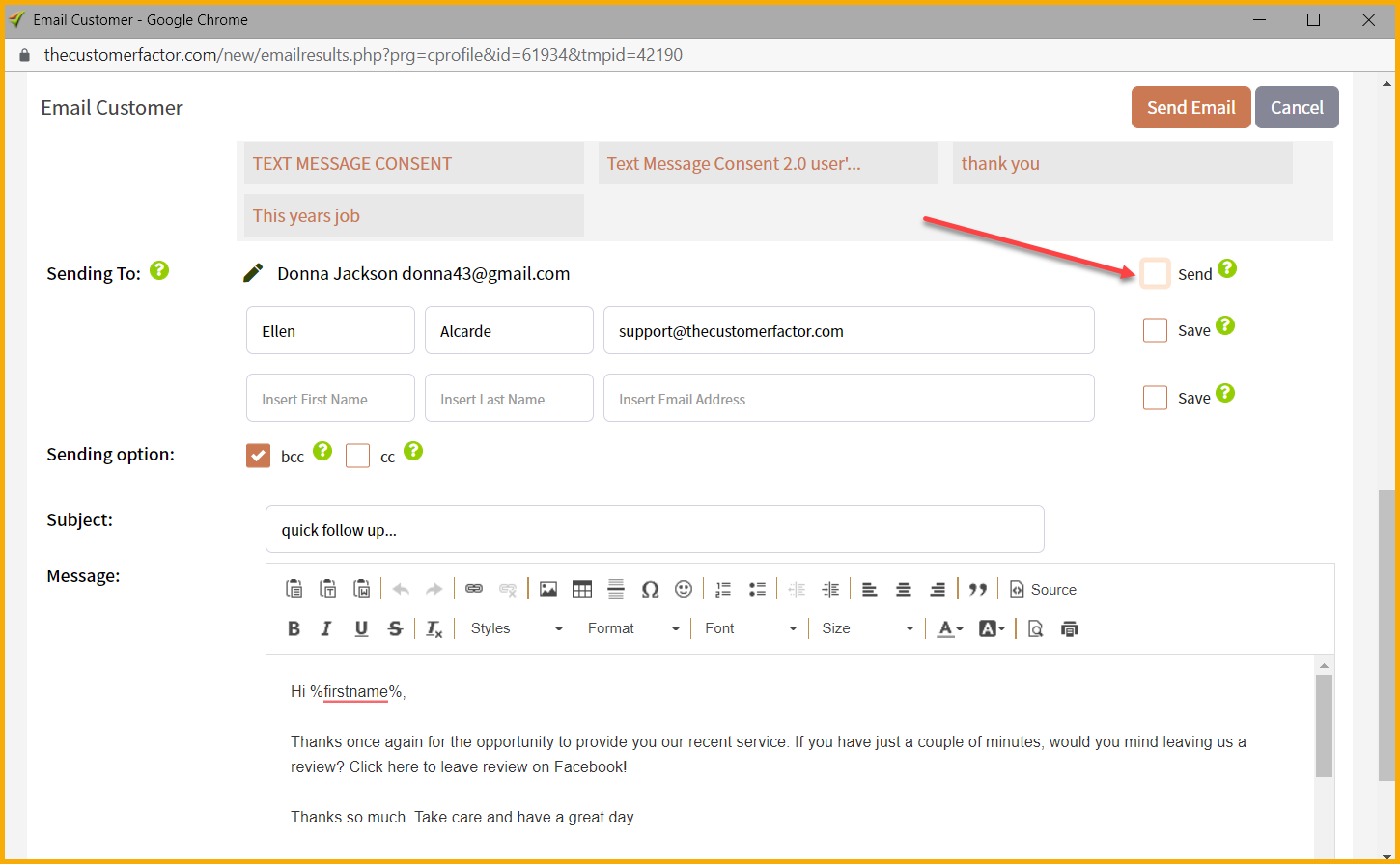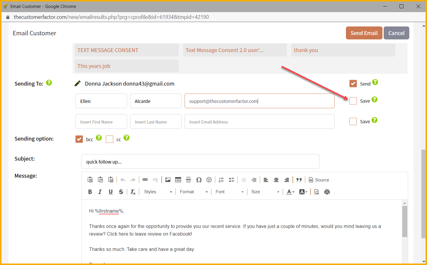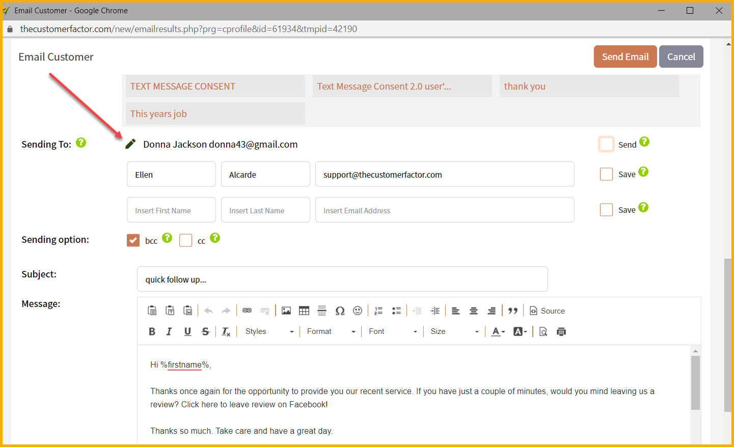 We have a new modification in The Customer Factor available in all email windows, where you can now see the email addresses you're sending the email to and add an additional email address or two or three if you need to send the email to more people. You can also uncheck an email address if you don't want to send it to any of the default email addresses on file for that particular prospect/customer you're sending the email to. Here is a screenshot: