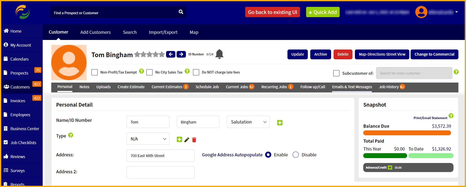 Just a quick note, the "Make 'em A Prospect" button can only be seen at the top of customer profile if there are no paid invoices for the customer. If a customer paid an invoice then obviously they are a legitimate customer who paid you for a job completed, so there's no reason to display the "Make 'em a Prospect" button in that case. In the screenshot below you'll see no "Make 'em a Prospect" button. This customer paid an invoice.