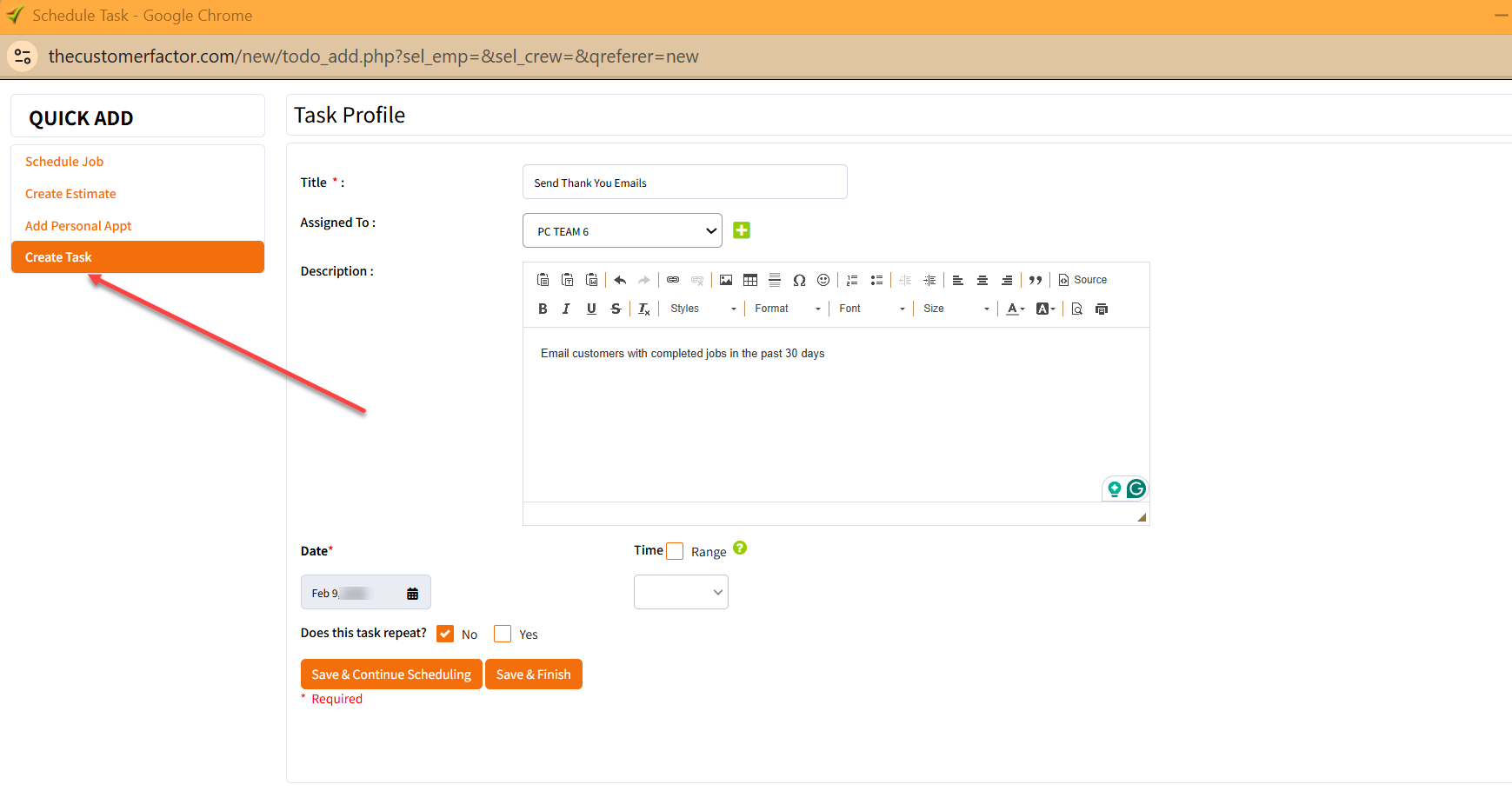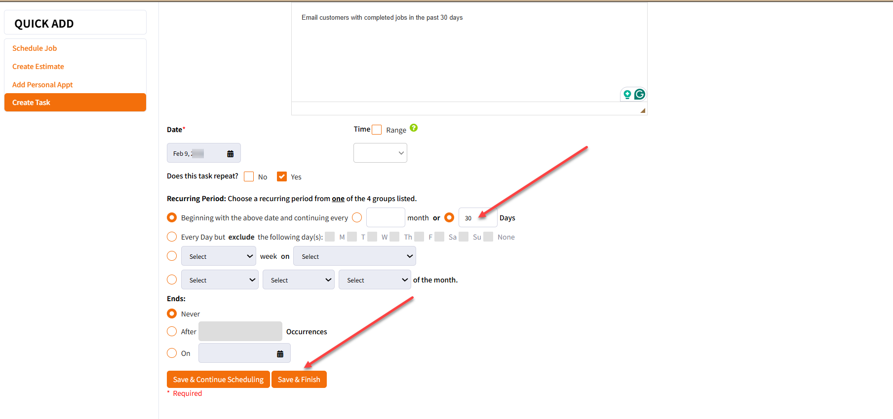 You can then select when you wish to repeat the task by ticking the radio button on the left and when done, just click "Save & Finish".