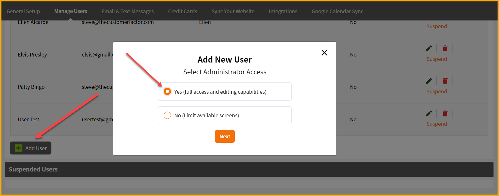 On the manage users screen, you can, of course, edit your own information (green pencil on the right) but as mentioned earlier, you can add additional users. These users can be administrators, where they can see everything in the software and the app or they can be non-administrators, where they are limited in what they can see in and do in both software and the app.