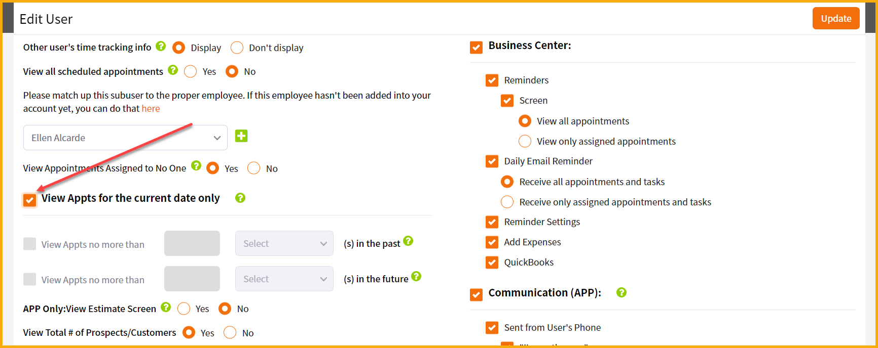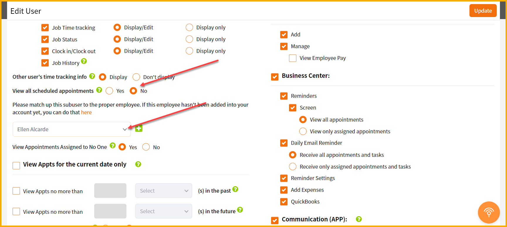 "View all scheduled appts" - Most users select "No" and then choose the employee in the dropdown. This means that the sub-user will only see what's assigned to him or her.