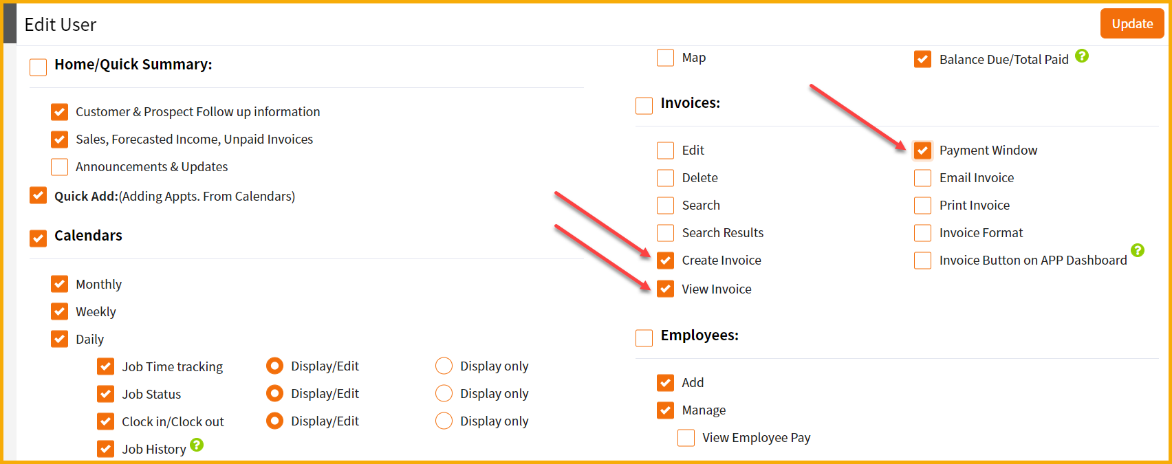 Please note that if the sub-user you're creating needs the ability to create and email invoices out in the field within the app then make sure to check the "Create Invoice", "View Invoice", and "Payment Window" rights as shown below.