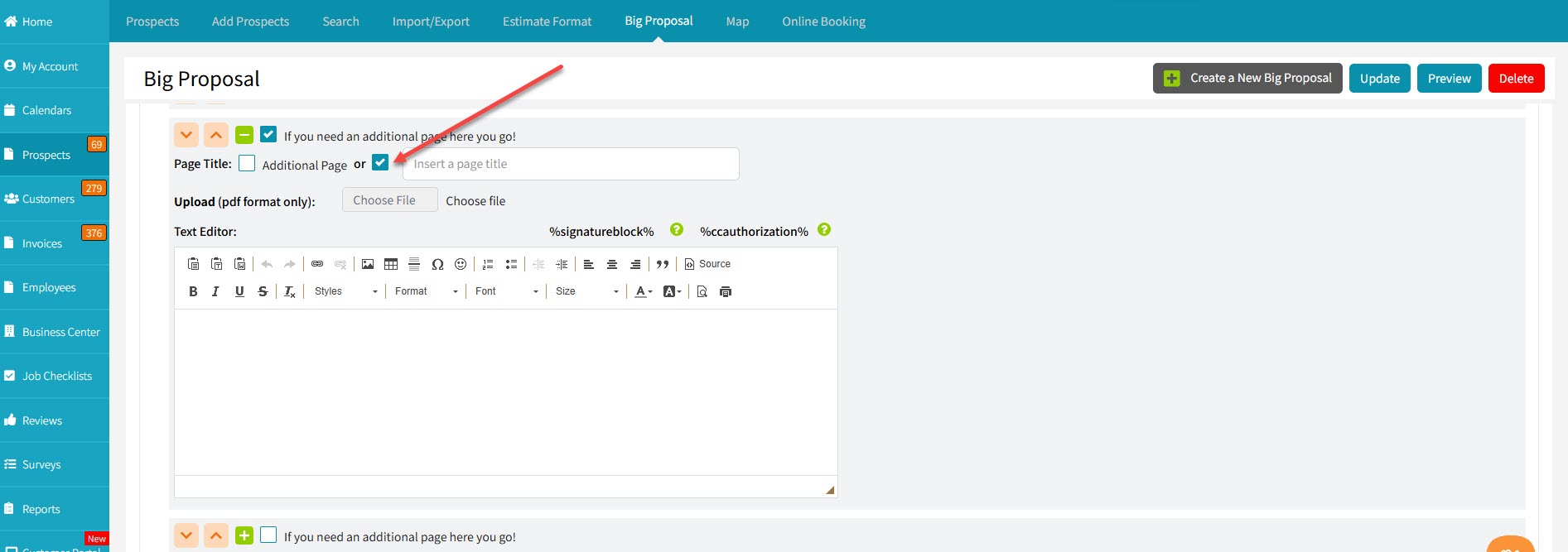 If you want to upload a PDF to a new page in your Big Proposal, click on any of the "If you need an additional page here you go!" to open the page, and rename it by checking the "Insert a page title" checkbox, inserting your new page title.