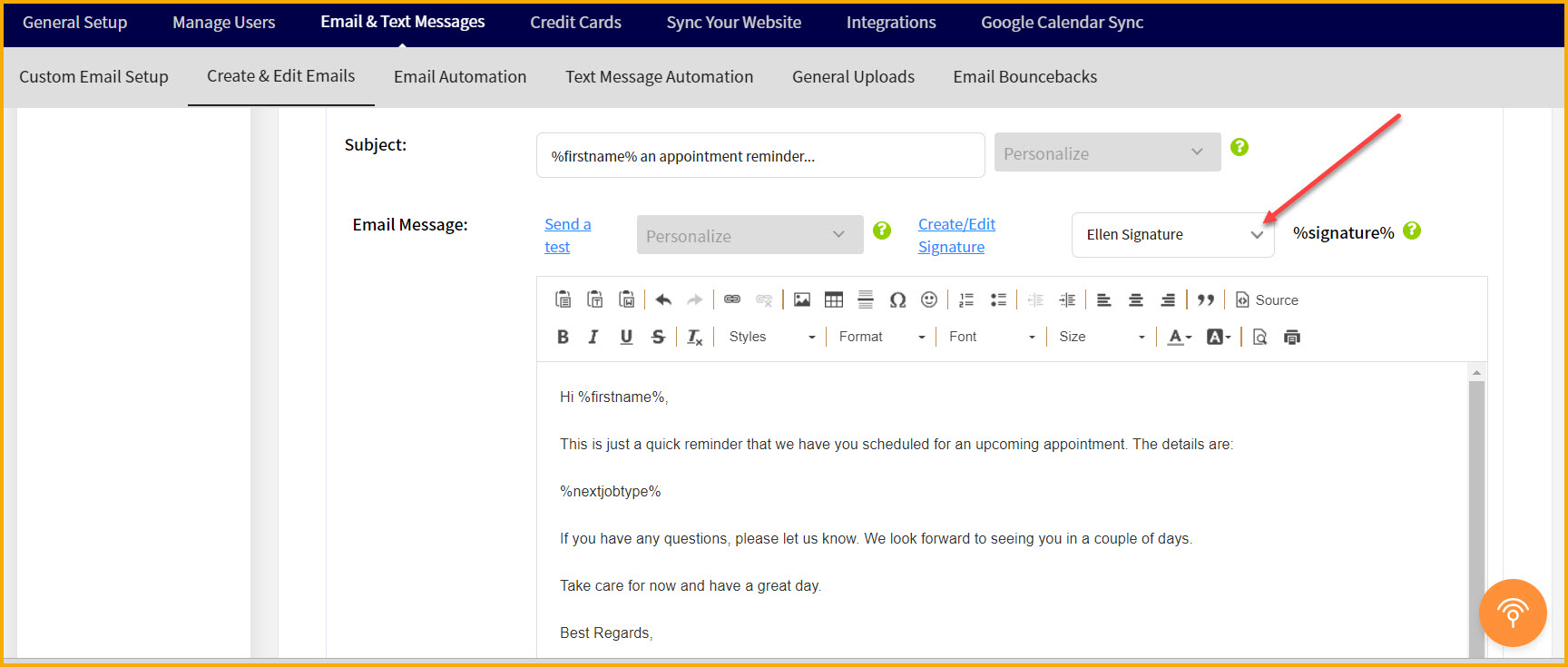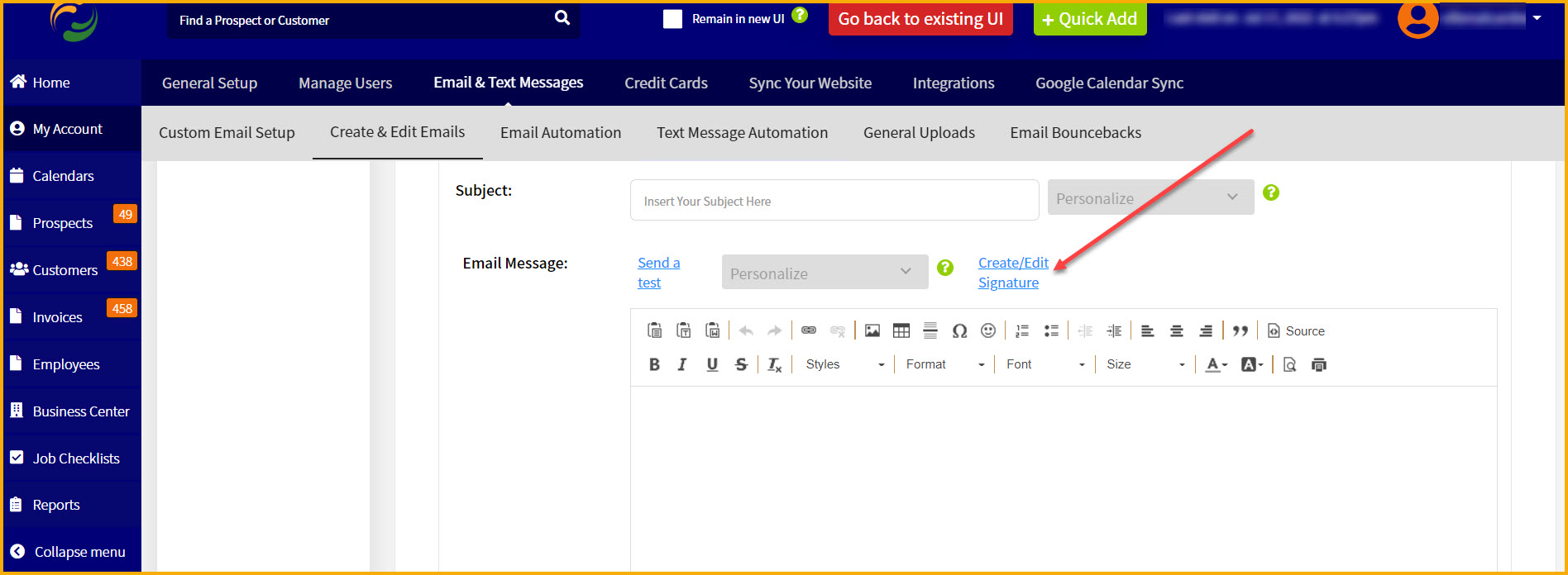 So first, you have to create the signature. If you go to the email settings screen you can open up any email and you'll see a "Create/Edit Signature" link above the editor: