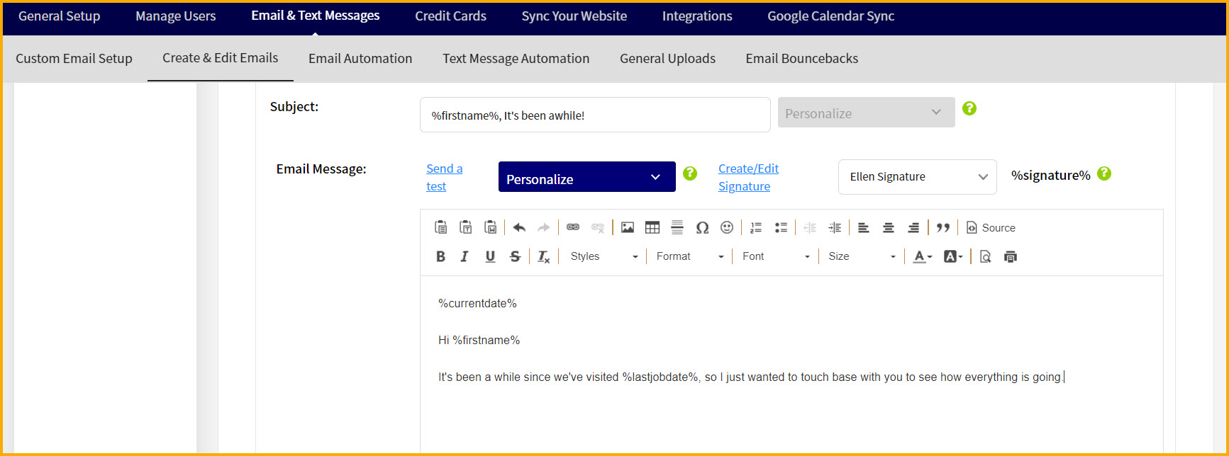 So here's a partial example of an email that I'm creating and I selected the current date option, first name option, and last job option: