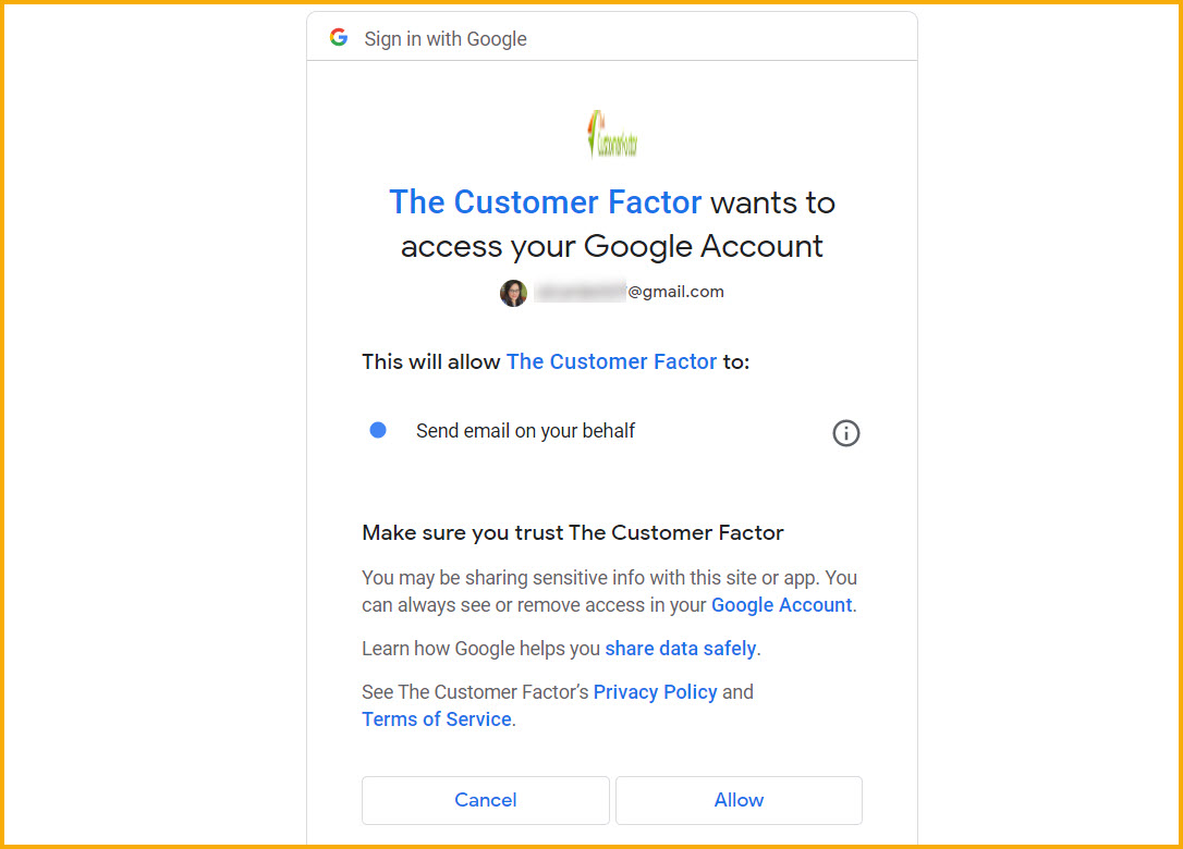 Make sure you're signed into the correct Gmail account and then click Allow. This will then allow CF to reroute all emails through your Gmail account when you send an email from The Customer Factor.