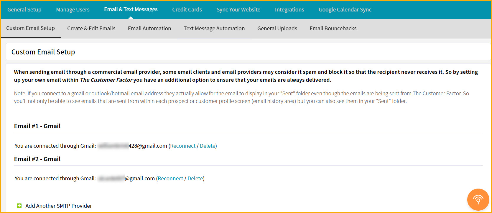 1.) It'll reduce undeliverable/bounced emails because instead of sending through a commercial email provider, you are emailing through your own email address. Commercial emails can be considered spam and can be blocked from time to time. Even though we use a high-quality commercial email provider (SendGrid), the fact of the matter is that other email clients and email providers know the email is coming from a commercial email provider. So some email clients/providers such as AOL, Comcast, and a few others, along with providers used by companies, can equate commercial email with spam which means the email may not reach the recipient. So setting up a custom email allows you to have the best of both worlds: the ease of emailing from within The Customer Factor w/o worrying about whether the person you're sending the email to will receive it.
