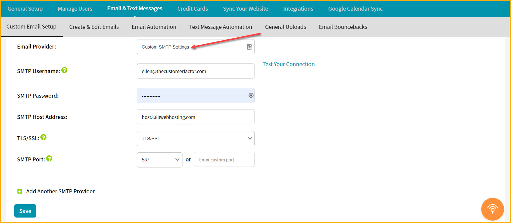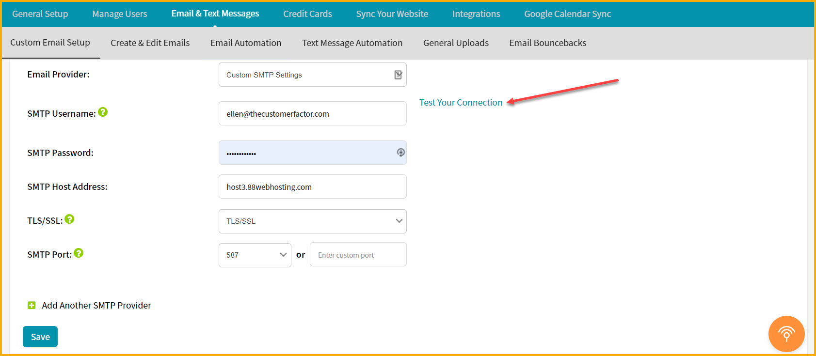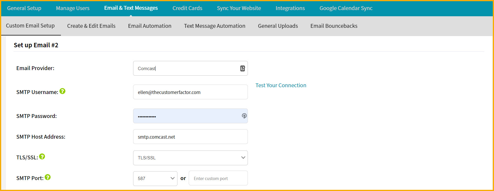 If you have any problems setting it up, make sure to check your password. It typically boils down to two issues if it doesn't work: password or host address. The bottom line is that you will be able to click the "Test Connection" link and see a successful response 100% of the time if the information being inserted on the custom email screen is correct.