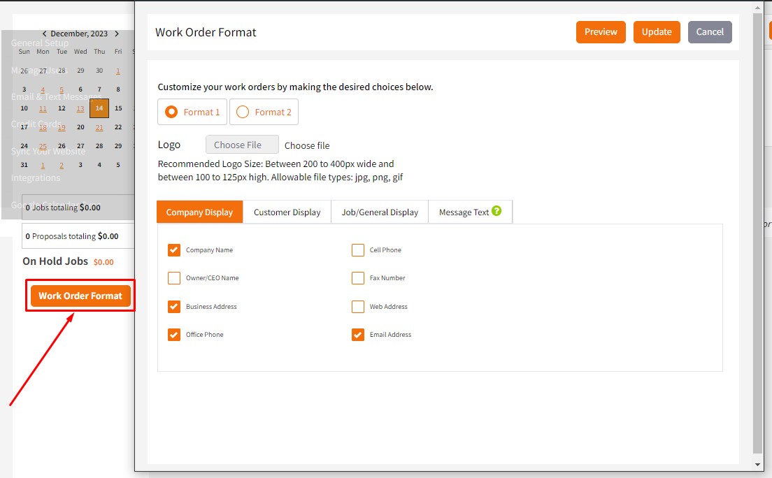 Within CF, you have the ability to customize the content that appears or doesn't appear on the printed work orders. You can access the work order format window on the daily calendar, located in the left sidebar.