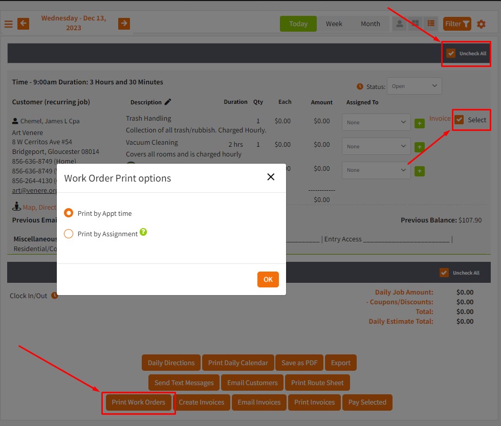 - After selecting the desired appointments, locate and click the "Print Work Orders" button at the bottom.