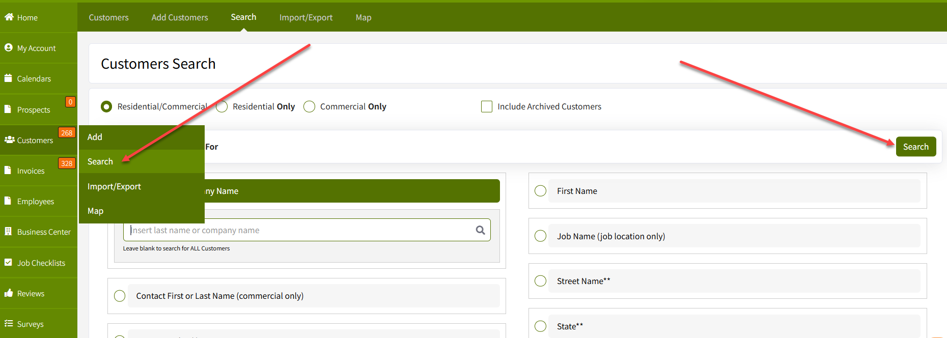 - Alternatively, go to the "Search" dropdown under the "Customers" tab, leave the last name/company name field blank, and click the search button.