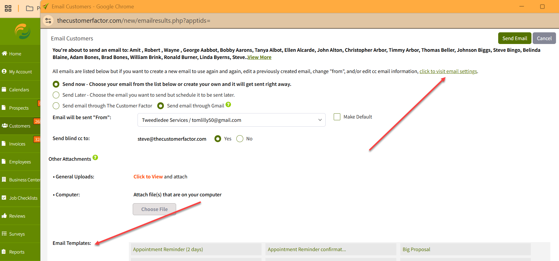 - In the "email customer" window, click the "click to visit email settings." link at the top.