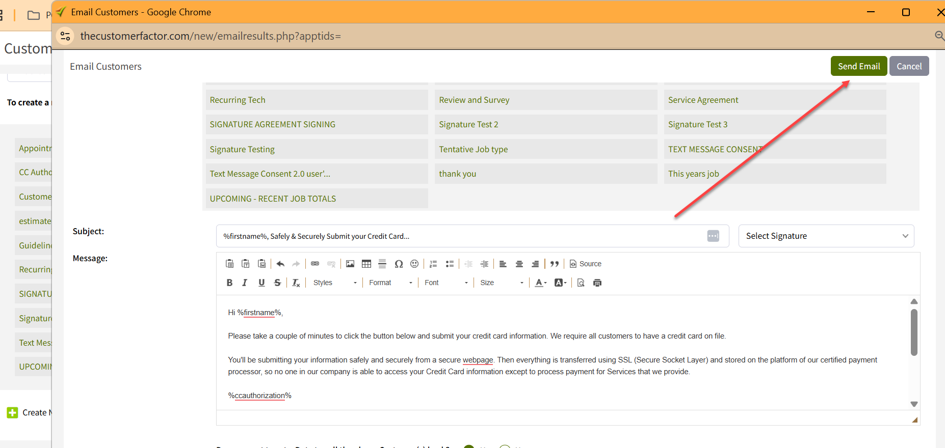 - Click the "Save and Close" button. This will take you back to the email customers window.