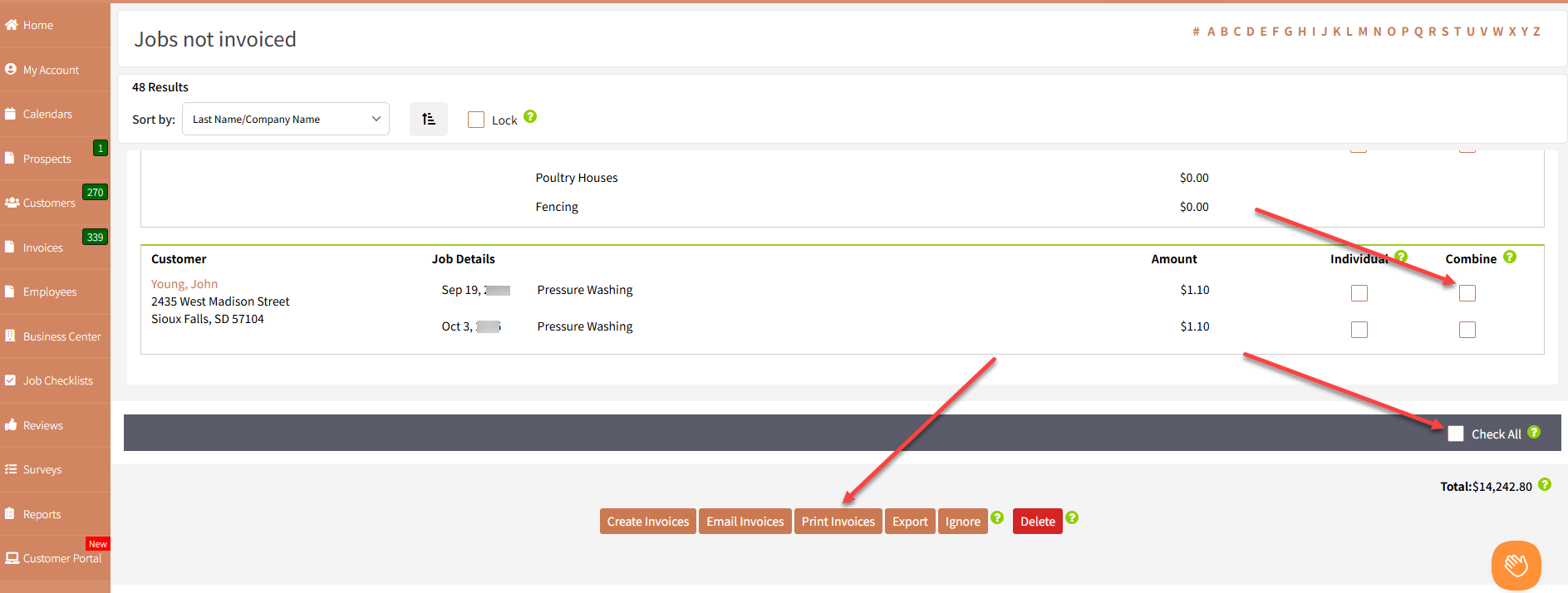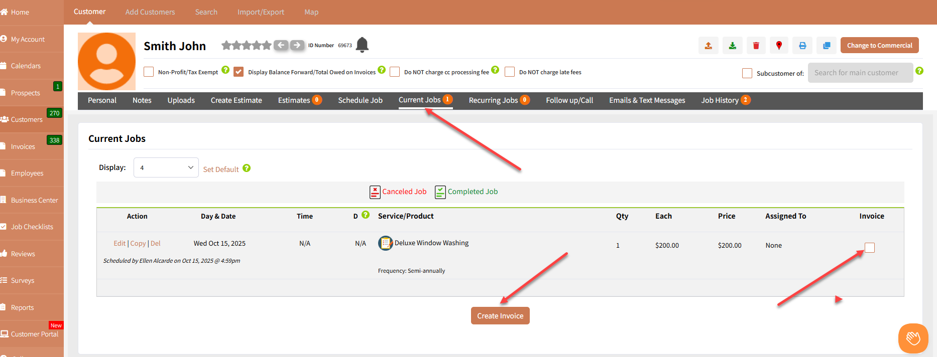 - Check the checkbox on the right, and scroll down to click the "Create Invoice: Current Job(s) ONLY" button.