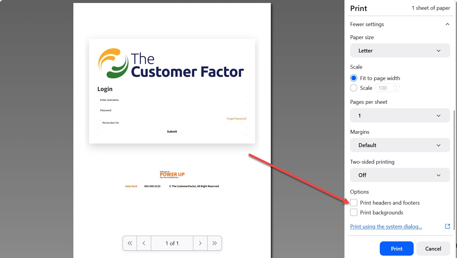 Since The Customer Factor is a web application, we're dependent on your internet browser. The best browsers are Google Chrome, Firefox, and Safari. Internet Explorer or Edge is not recommended. So, assuming you're using Firefox (if not, then visit the Google Chrome article), we'll first discuss removing headers and footers info in order for you to be able to print clean estimates and invoices. Then we'll discuss disabling pop-ups.