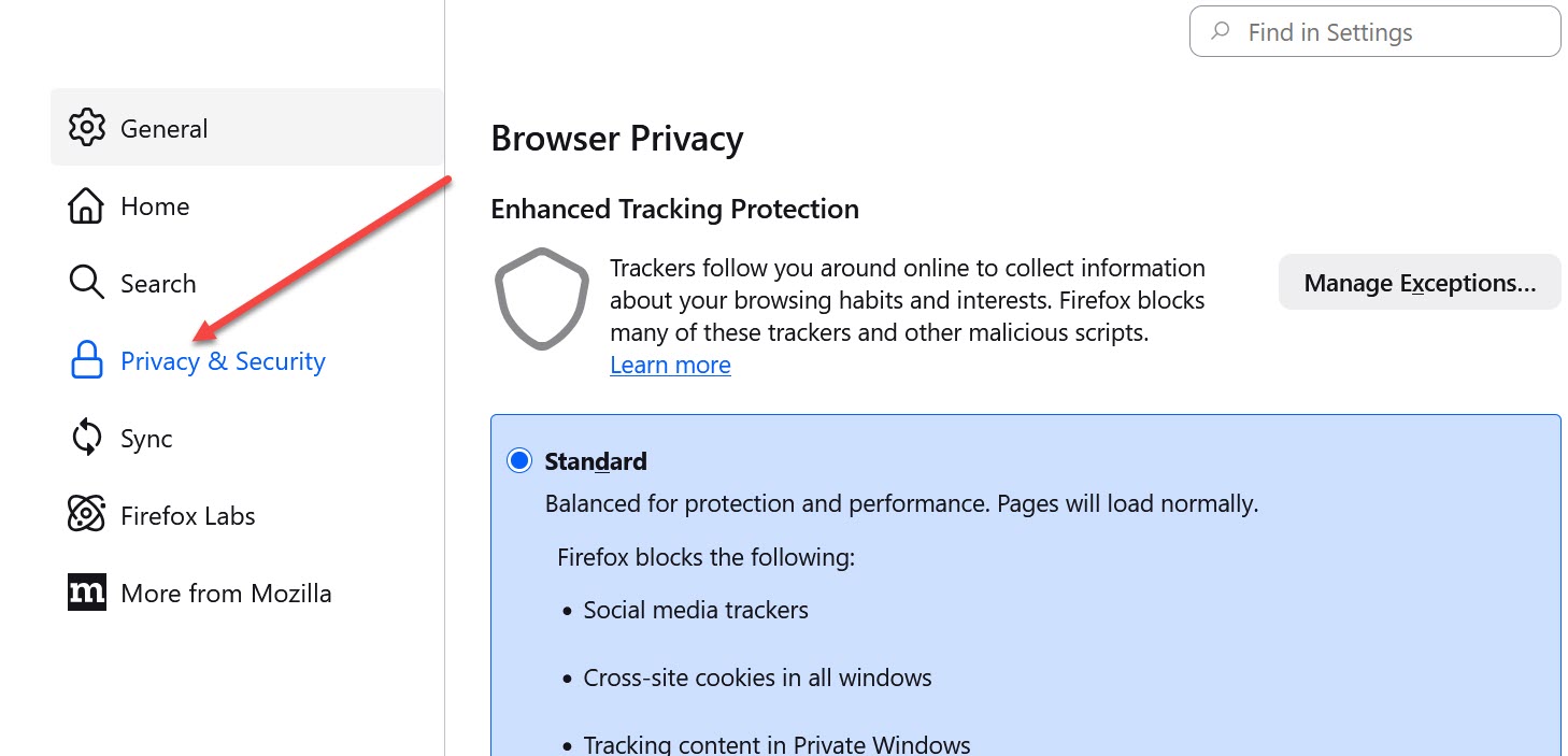 Make sure to click on "Privacy & Security" at the left.