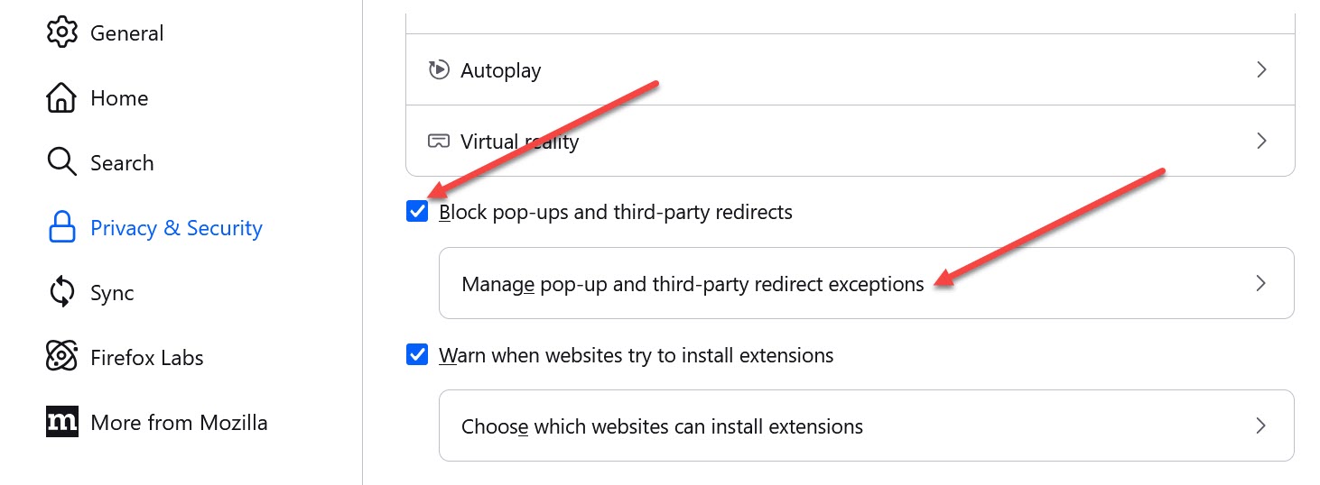 Click “Manage pop-up and third-party redirect exceptions”, then add both