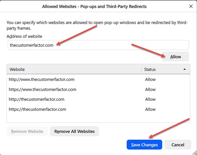 "thecustomerfactor.com" and "www.thecustomerfactor.com", set them to Allow, and save the changes.