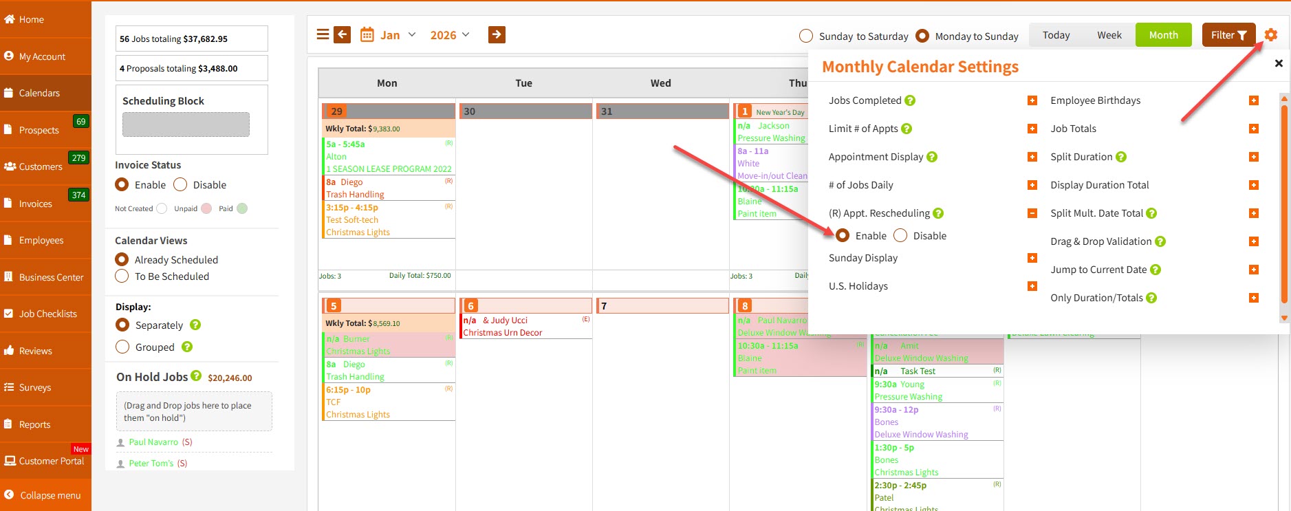 Important: For those of you who have a lot of recurring jobs, make sure to enable the option in the right sidebar, click on the Settings (gear icon) and click Enable under "(R) Appointment Rescheduling". This means that whenever you have a job that is being rescheduled and it's recurring when you drag and drop it to another date, a window will open up asking you whether you want to reschedule just that single job or all jobs in the recurring series of jobs. This a very useful option that allows you to easily reschedule all recurring jobs for any customer.