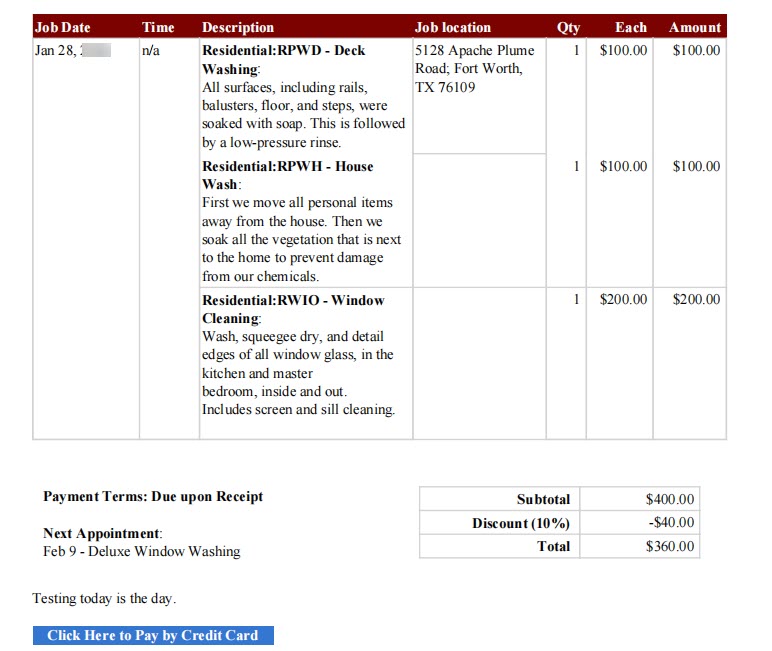 These job details are tied to each job and will display this way on all screens and on printed pages. For example, when you print an invoice for this customer with these 3 jobs on it, including the job details, this will be how it displays in the description area: