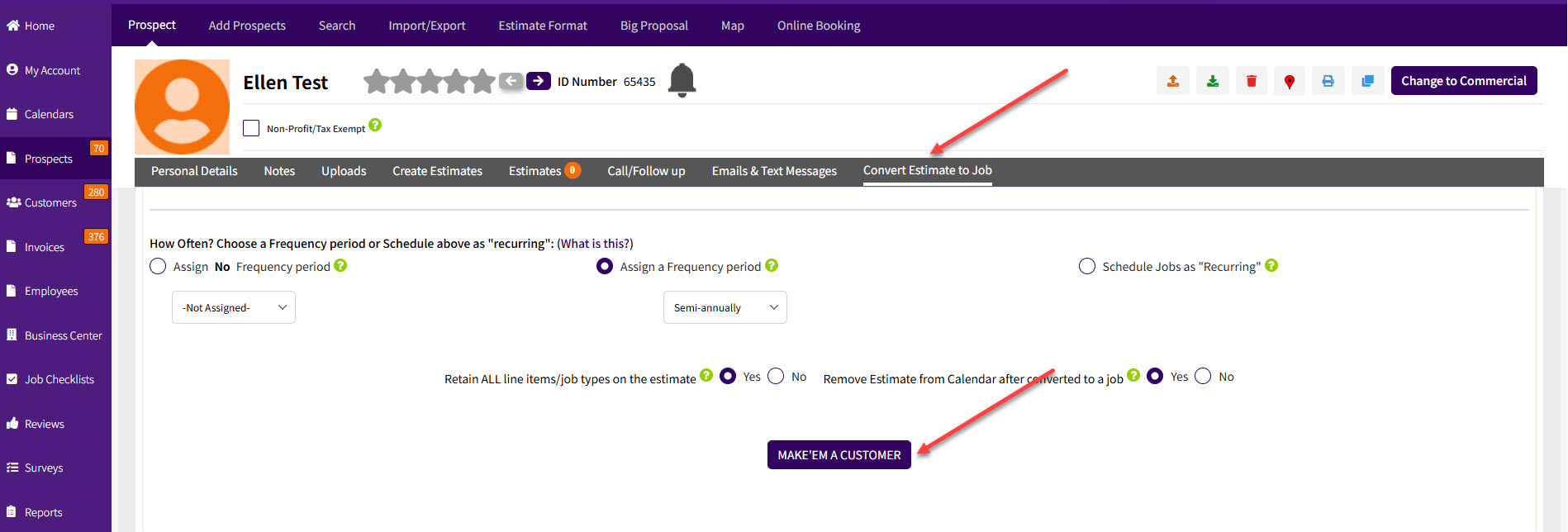 You will find the "Make 'em a Customer" button in the "Convert Estimate to Job" tab, in the prospect profile screen. Scroll down and click on the "Make 'em a Customer" to convert the prospect into a customer.
