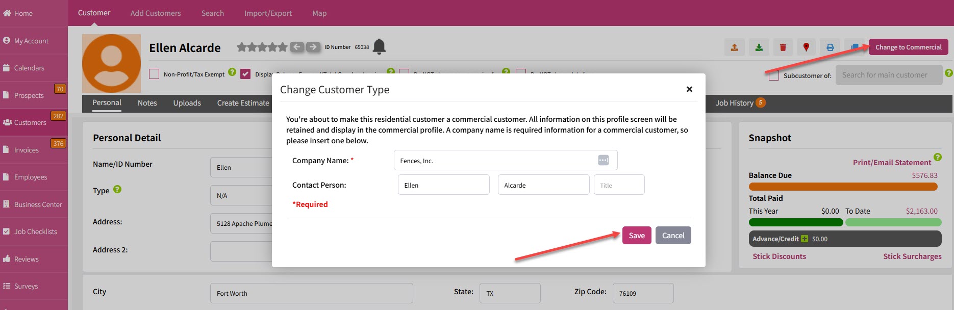 So let's assume you want to change a residential customer to a commercial customer. Click the "Change to Commercial" button at top right. Add the company name and click Save, just like this: