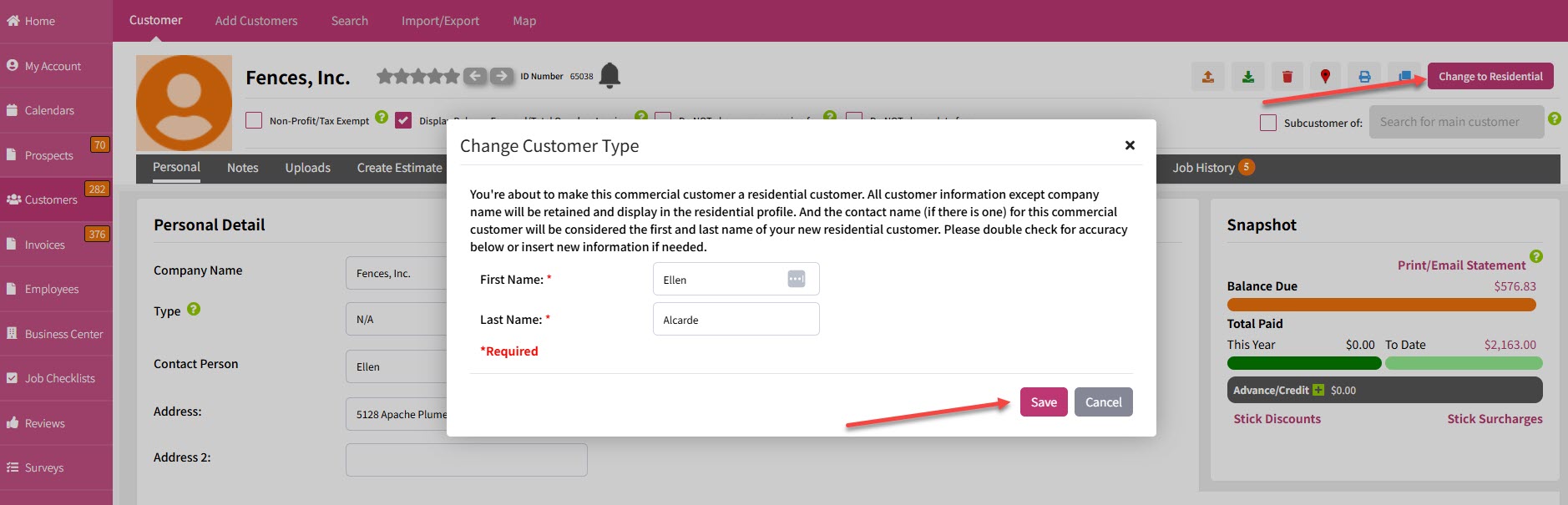 Now let's say you need to change a commercial customer to a residential customer. Click the "Change to Residential" button at top right, correct the info in the window if necessary, click Save, and you're done: