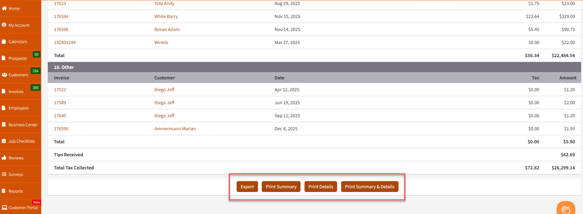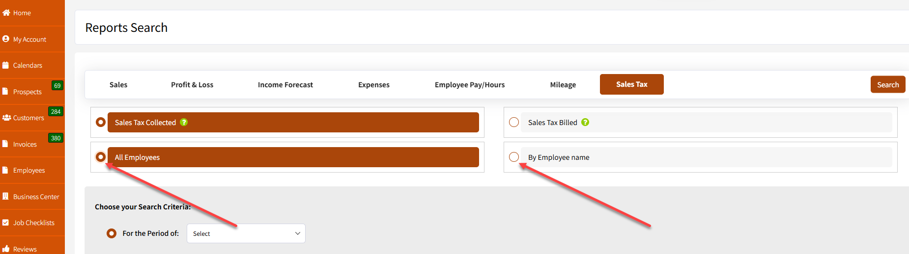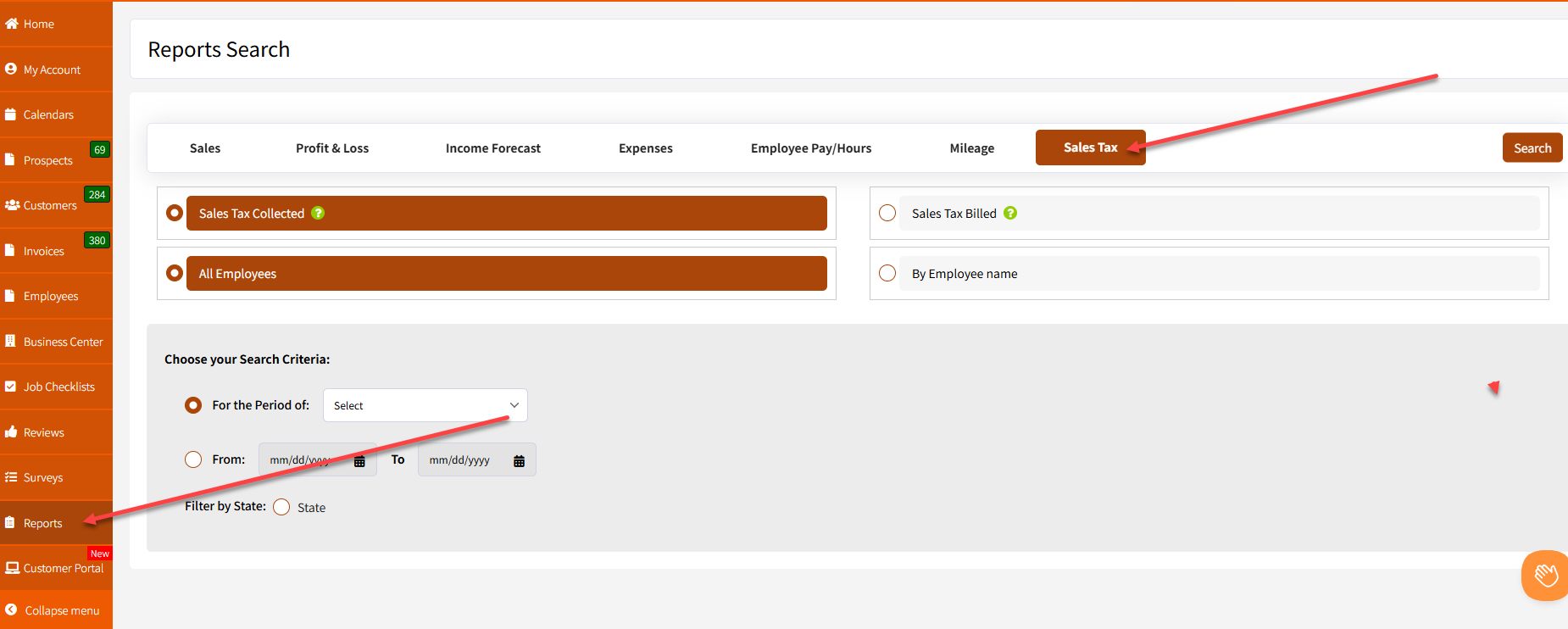 You can access the “Reports” from the homepage by going to the “Reports” tab at the lower left and clicking on the "Sales Tax" button.