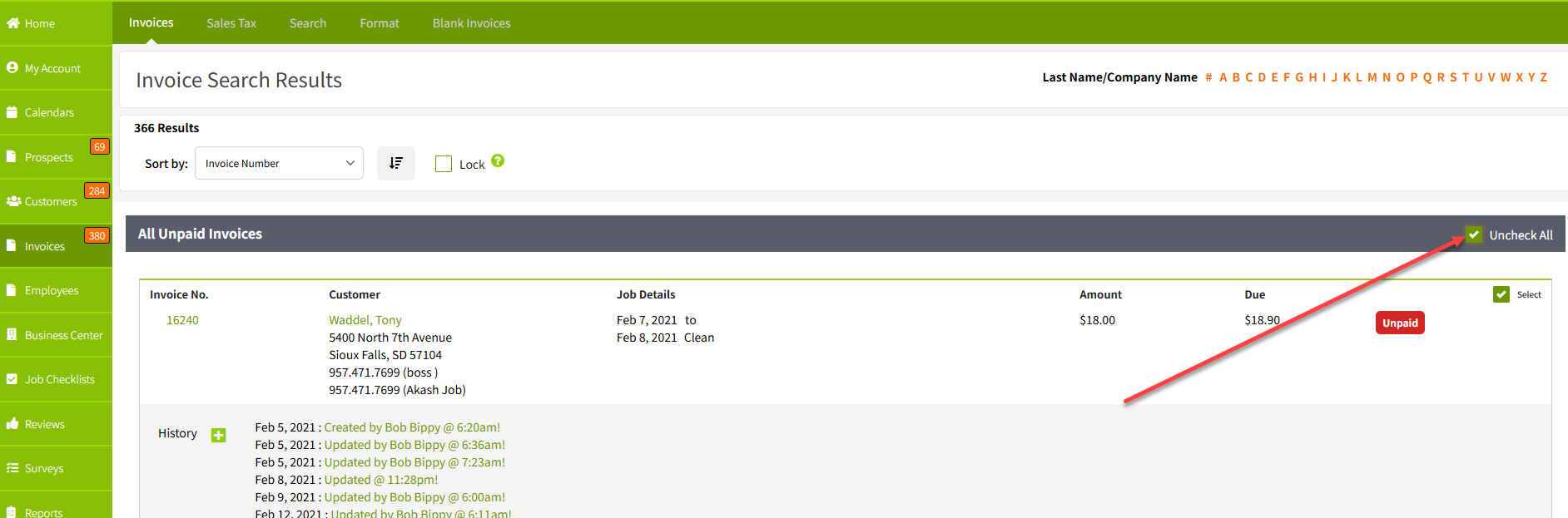 Sending a payment reminder can be done in the invoice screen. Simply click the "Check All" box at the upper right of the screen. This will mark all the unpaid invoices that you want to send to customers. If you need to exclude a customer, all you need to do is uncheck the box at the right of their name.